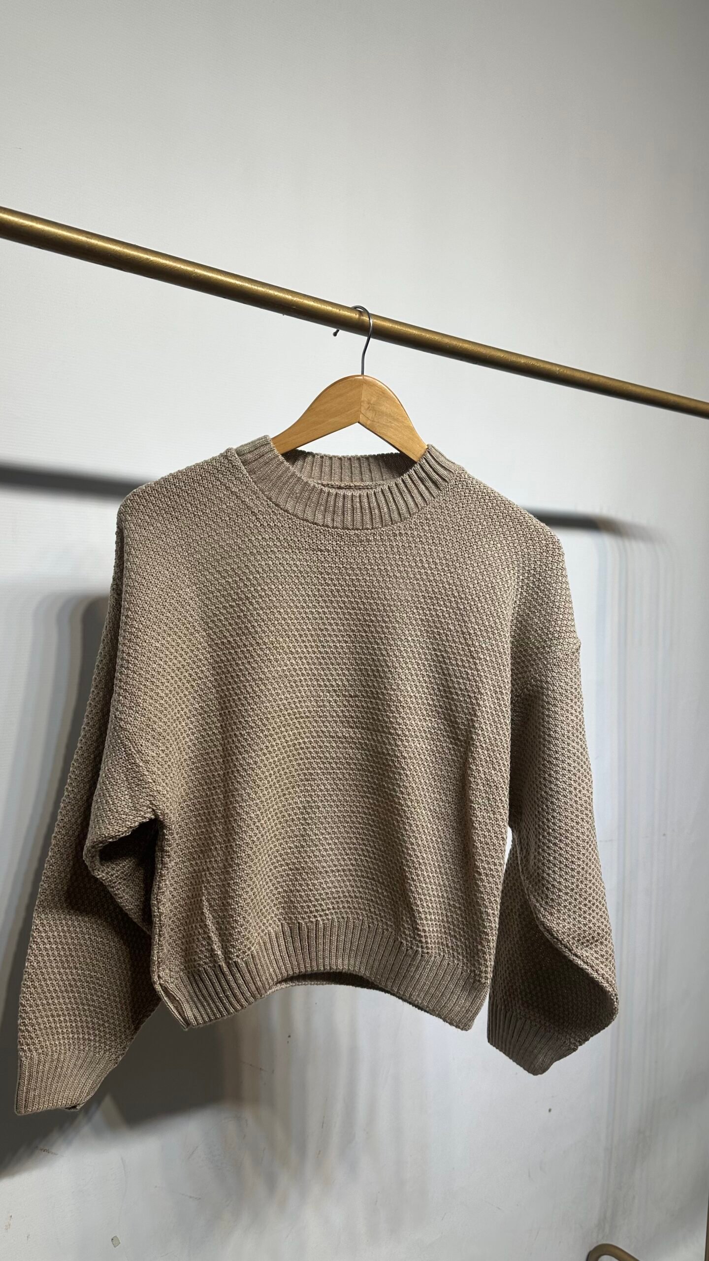 Sweater tejido de punto texturado en tono beige, de diseño minimalista y versátil. Presenta cuello redondo con terminación acanalada, al igual que los puños y el ruedo, que aportan estructura a la prenda.