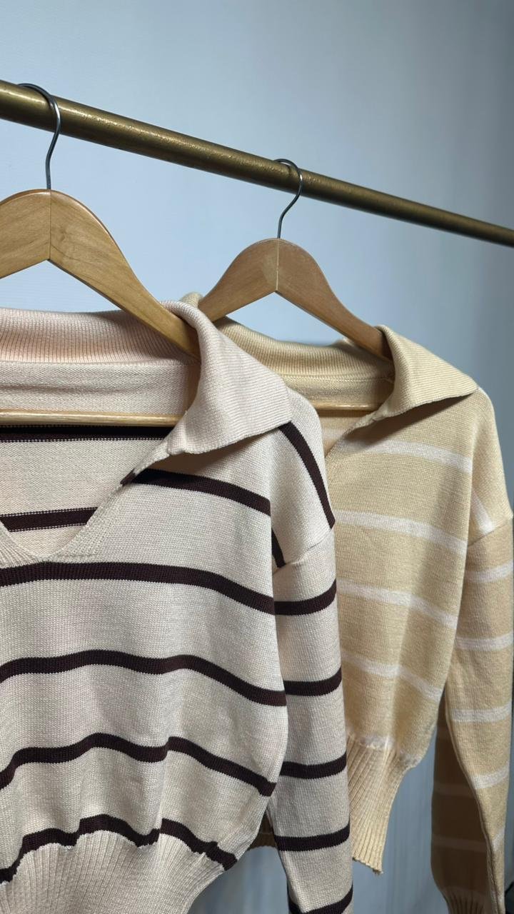 Sweater tejido de punto fino con diseño a rayas horizontales en tonos neutros. Presenta cuello tipo polo con escote en V, que aporta un aire canchero y relajado.