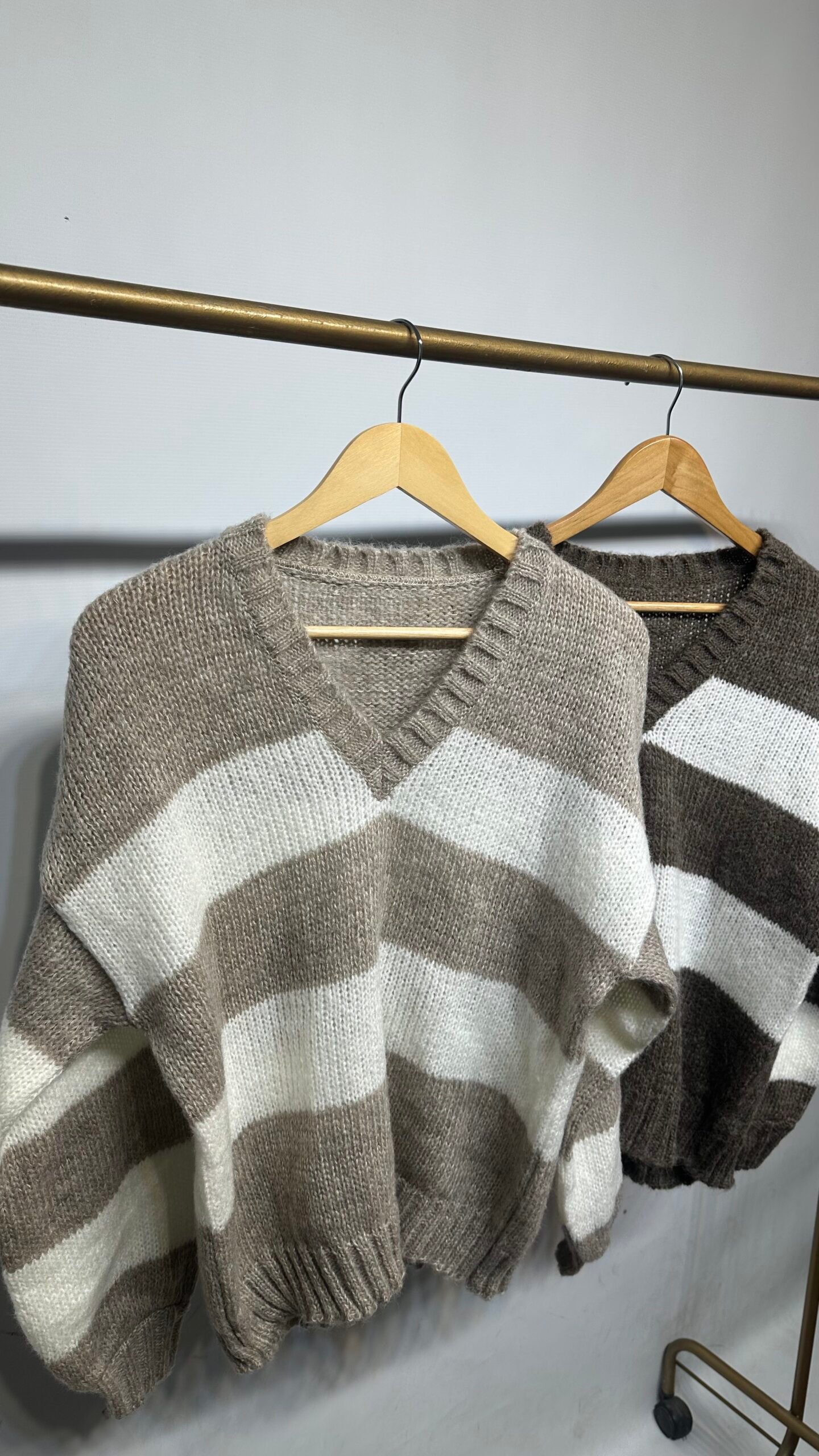 Sweater tejido de punto suave con diseño de rayas anchas en contraste, disponible en tonos neutros. Presenta escote en V con terminación acanalada, que estiliza el cuello y aporta un aire relajado.
