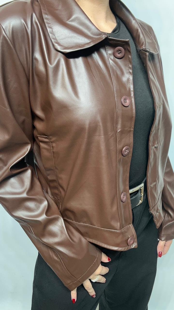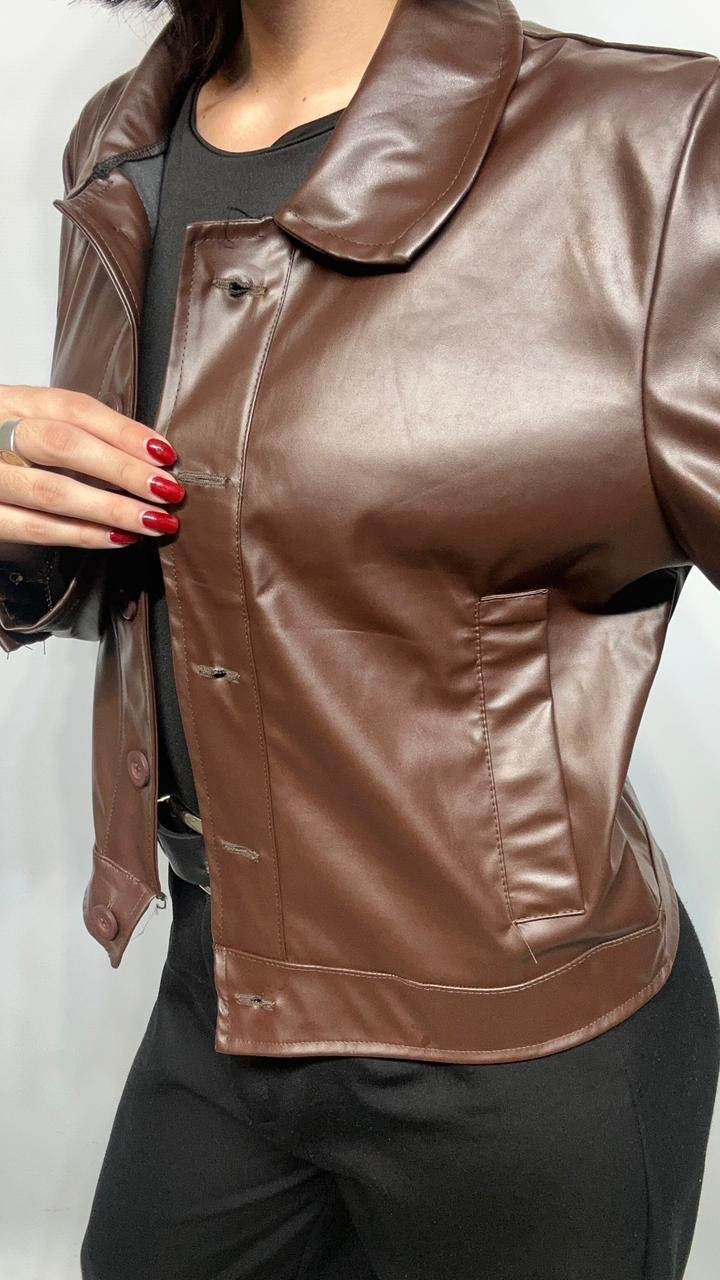 Chaqueta corta de acabado simil cuero en tono marrón chocolate, con textura suave y levemente brillante. Presenta cuello amplio tipo solapa redondeada que aporta un aire clásico. El frente se cierra con botones a tono, alineados en tapeta central.